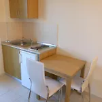 Dessutom finns vattenkokare, köksredskap och kylskåp här.
